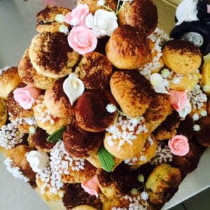 Pièce montée à base de choux à la crème pâtissière et de nougatine. Contactez-moi pour plus d’informations ou pour commander.